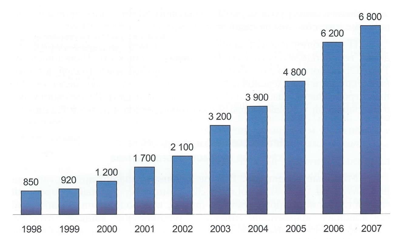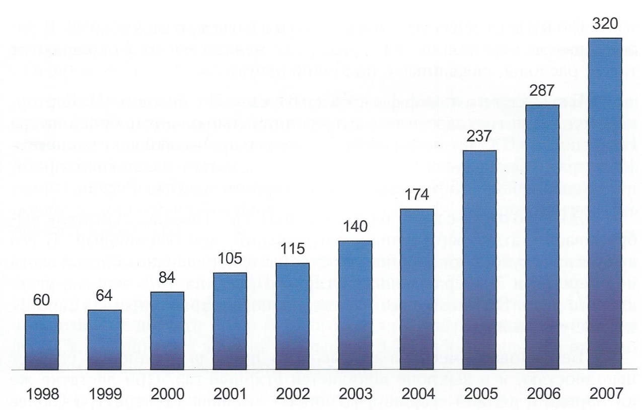 Рис. 59.18. Рост мирового парка легковых автомобилей, работающих на метане, тыс. ед.