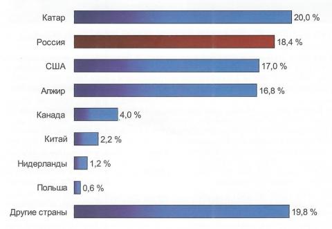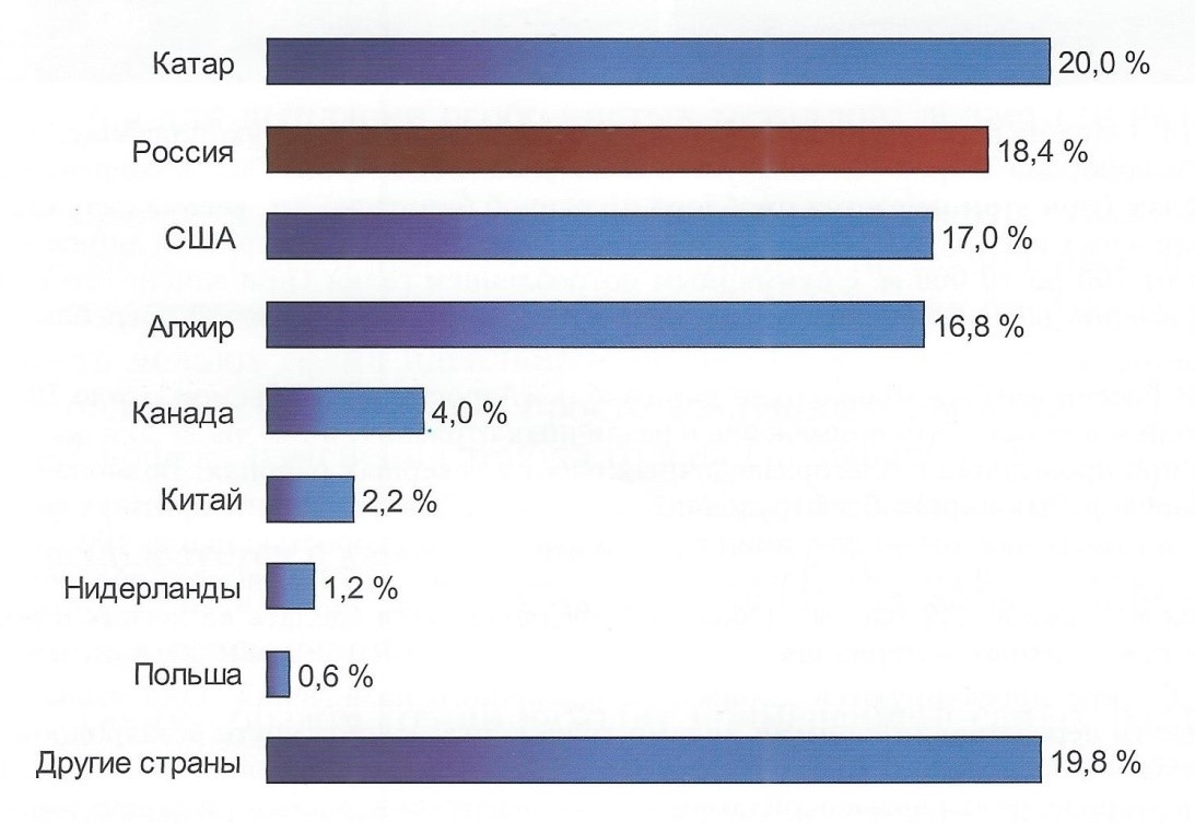 Доля России в мировых ресурсах и запасах газа и в мировой газоперерабатывающей промышленности
