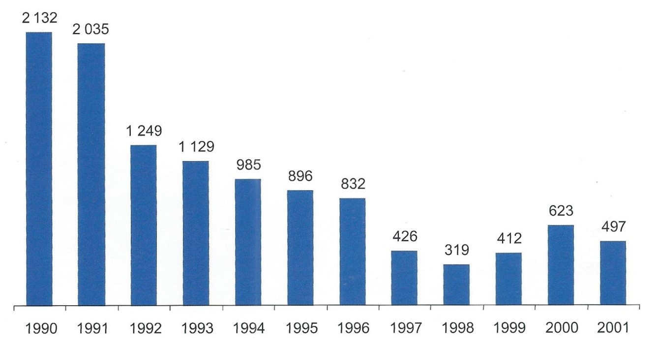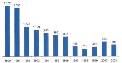 Рис. 47.4. Динамика промышленного лова рыбы в Иркутской области в период кризиса 1990-х гг., т