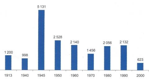 Рис. 47.3. Динамика промышленного лова рыбы в Иркутской области в XX в., т